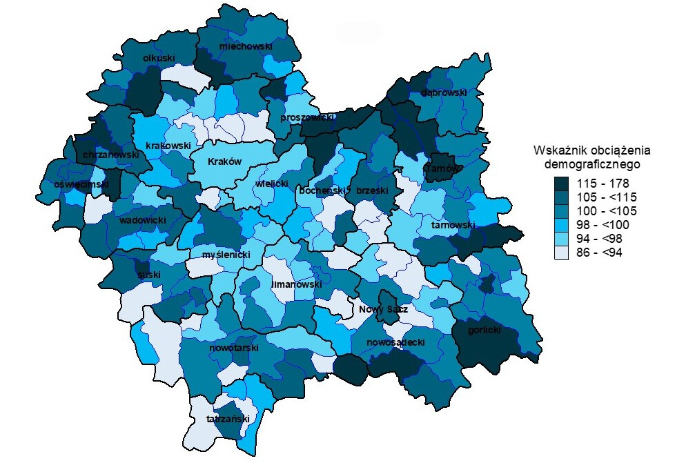 Mapa. Prognozowany wskaźnik obciążenia demograficznego w gminach województwa małopolskiego w 2060 roku
